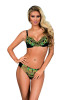 Usztywniane miseczki uszyte z podwojonej pianki z bawełnianą kieszonką w dolnej części, a z zewnątrz zrobione z przepięknego haftu koloru czarnego z odcieniami zieleni i żółtego złota. Ten fason też bardzo funkcjonalny ponieważ oprócz ładnego dekoltu dobrze zbiera biust, dodaję mu objętości i zapewnia naturalny krągły kształt . Wkładki wyjmowane, również można nimi regulować dysproporcji biustu (wkładając dwie do jednej kieszonki lub nie wkładając żadnej ).Biustonosz posiada profilowane druty dla lepszego przylegania do ciała . Zaletą są odpinane ramiączka w tym modelu. Zapięcie z tylu na dwie haftki z trzystopniową regulacją obwodu .Boczki uszyte z miękkiej mikrofibry ,a niska baskinka z haftu ozdobiona małą kokardką.
