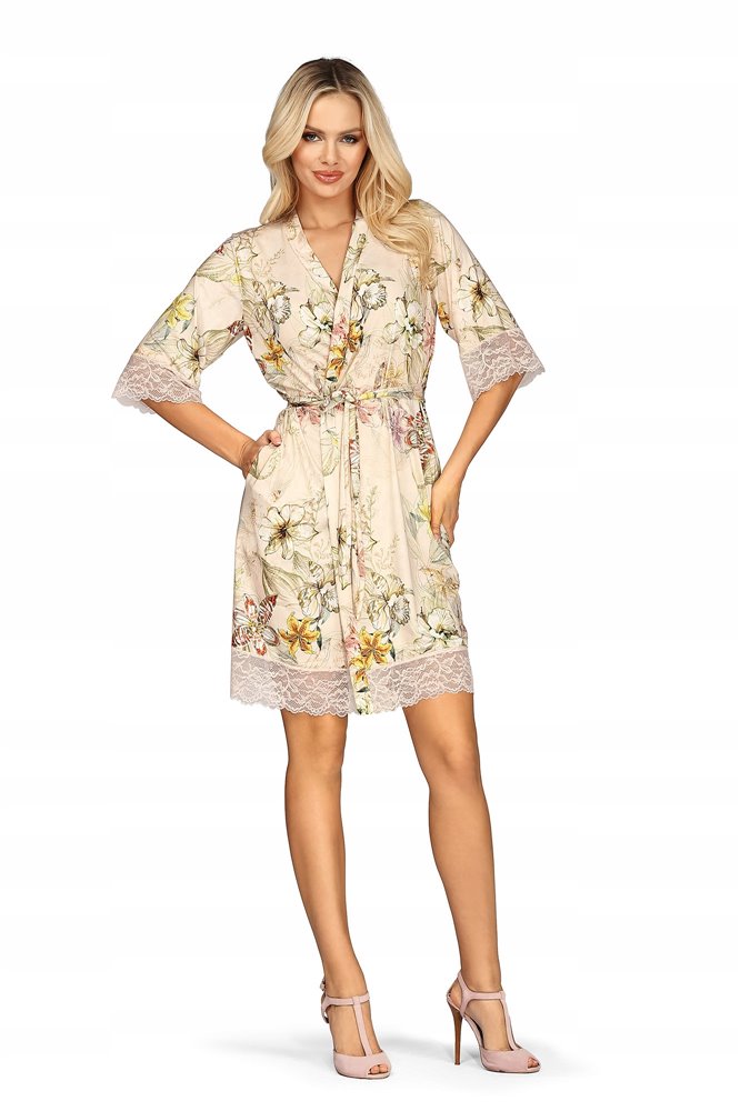 - Szlafrok ozdobiony na dekolcie i na dole rękawów elastyczną miękką koronką w kolorze pudrowy beż.